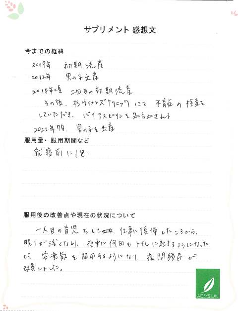 一人目の育児をして、仕事に復帰したころから、眠りが浅くなり、夜中に何回もトイレに起きるようになったが、安垂散を服用するようになり、夜間頻尿が改善しました。