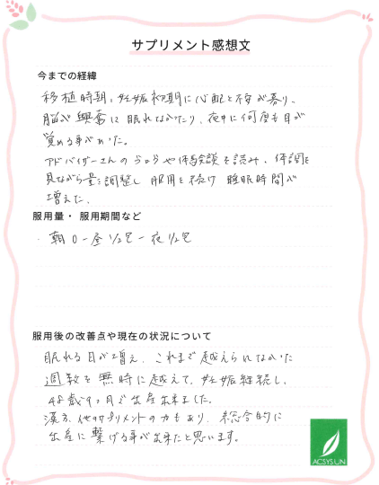 移植時期、妊娠初期に心配と不安が募り、脳が興奮して眠れなかったり、夜中に何度も目が覚める事があった。