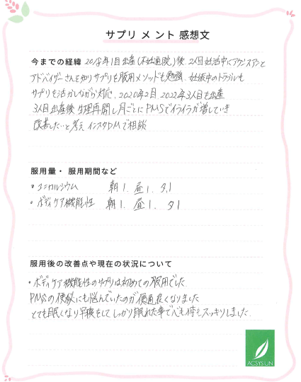 2018年1目出産(不妊通院)後、2人目妊活中にアクシスアンとアドバイザーさんを知り サプリを服用 メソッドも勉強、妊娠中のトラブルもサプリを活かしながら対応、2020年2月、2022年3人目を出産