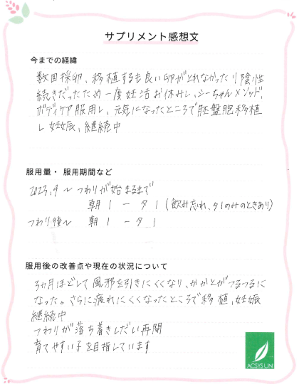 数回採卵、移植するも良い卵がとれなかったり 陰性続きだったため 一度妊活お休みし、シーちゃんメソッド、ボディケア服用し、元気になったところで胚盤胞移植し妊娠、継続中