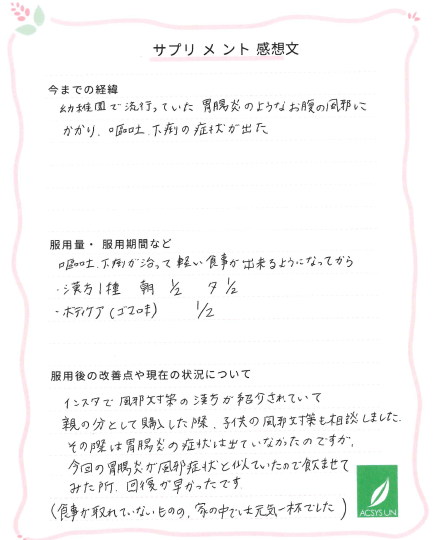 その際は胃腸炎の症状は出ていなかったのですが、今回の胃腸炎が風邪症状と似ていたので 飲ませてみた所、回復が早かったです。