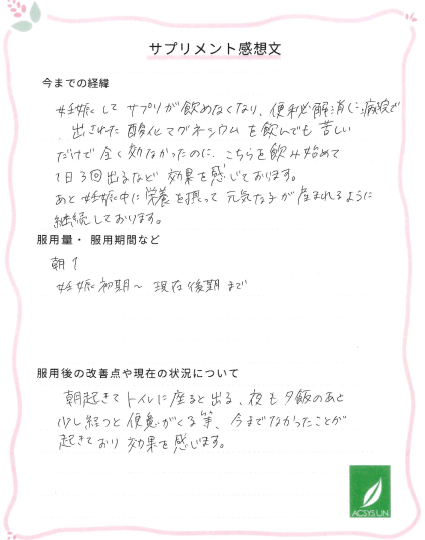妊娠してサプリが飲めなくなり、便秘解消に病院で出された酸化マグネシウムを飲んでも苦しいだけで全く効なかったのに、こちらを飲み始めて1日3回出るなど 効果を感じております。