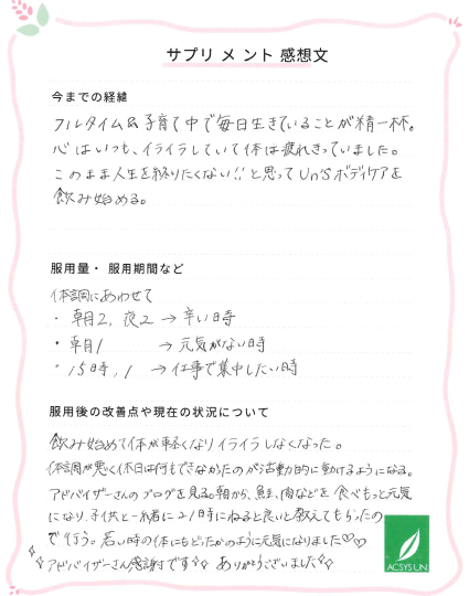 このまま人生を終わりたくない!!と思ってUn’sボディケアを飲み始める。