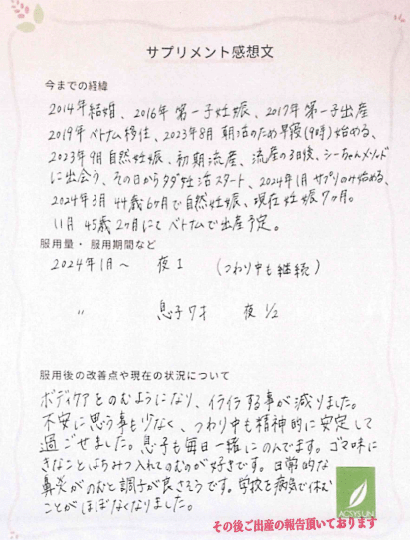 2024年1月サプリのみ始める、2024年3月44歳6ヶ月で自然妊娠、現在妊娠7ヶ月。11月45歳2ヶ月にてベトナムで出産予定。