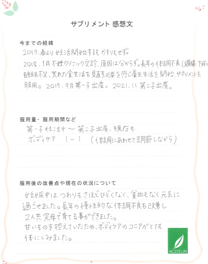 長年の慢性的な体調不良も改善し 2人共完母で育てる事ができました。