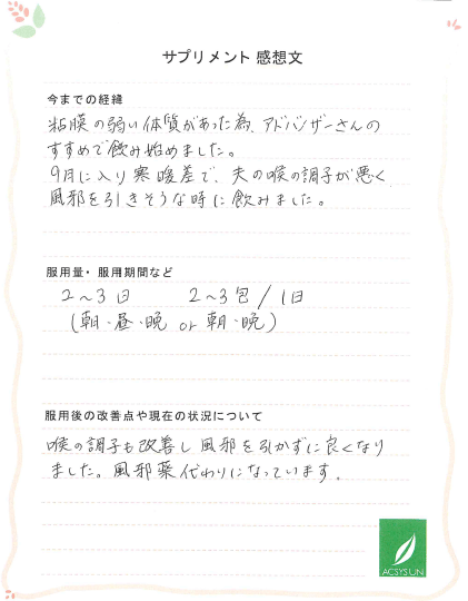 粘膜の弱い体質があった為、アドバイザーさんのすすめで飲み始めました。