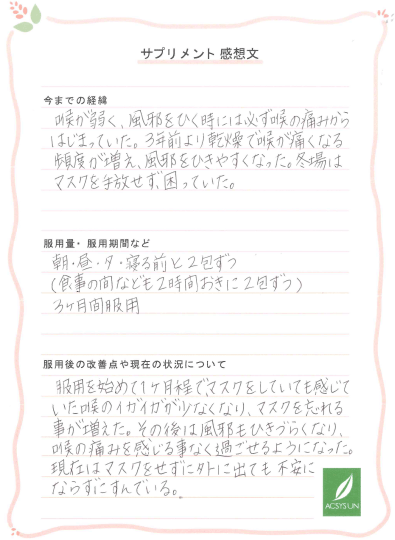 服用を始めて1ケ月程で、マスクをしていても感じていた喉のイガイガが少なくなり、マスクを忘れる事が増えた。