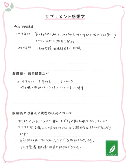 2023年4月 第2子妊活にあたり、20代の頃よりおりものが減ったことが気になり、メソッドに加え服用を開始