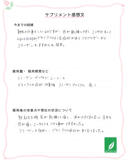 コラーゲンを服用し、ドライアイの症状が良くなりました。