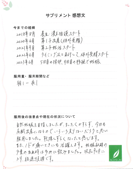 自然妊娠を目指しましたが、まったくかすらず、今回も高齢出産になるので いろいろ足りないんだろうと思い服用しました。