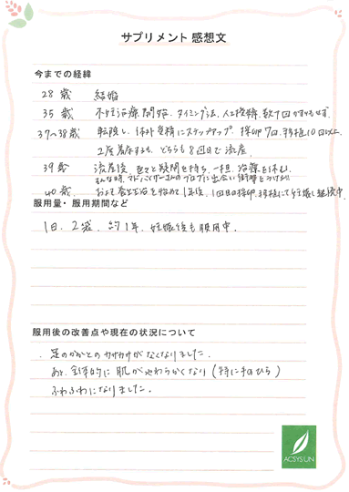 40歳 およそ養生生活を始めて1年後、1回目の採卵、移植にて妊娠し継続中