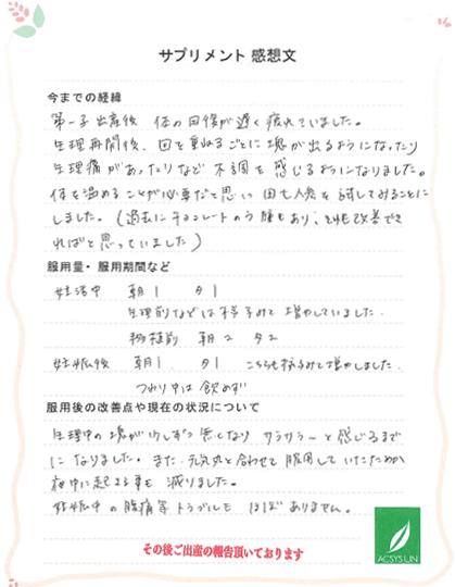 生理再開後、回を重ねるごとに塊が出るようになったり生理痛があったりなど不調を感じるようになりました。