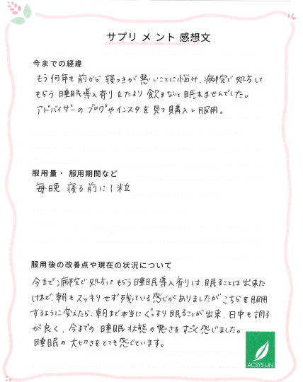 もう何年も前から寝つきが悪いことに悩み、病院で処方してもらう睡眠導入剤をたより 飲まないと眠れませんでした。