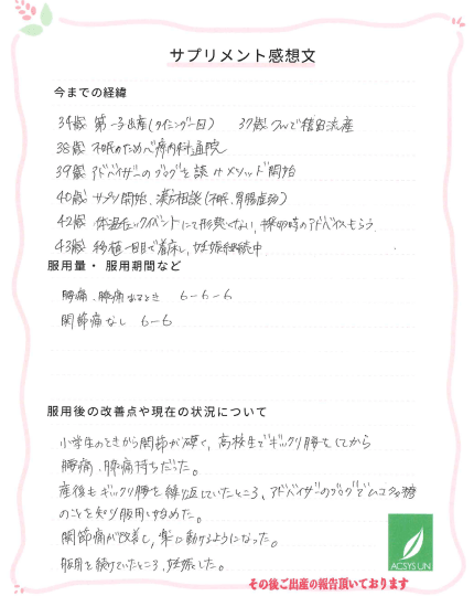 産後もギックリ腰を繰り返していたところ、アドバイザーのブログでムコ多糖のことを知り服用し始めた。