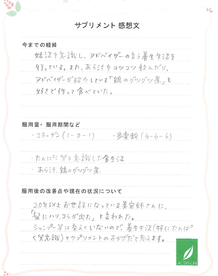 ★こちらの感想文はUn’sⅡ型コラーゲンペプチドのページにも掲載されています。