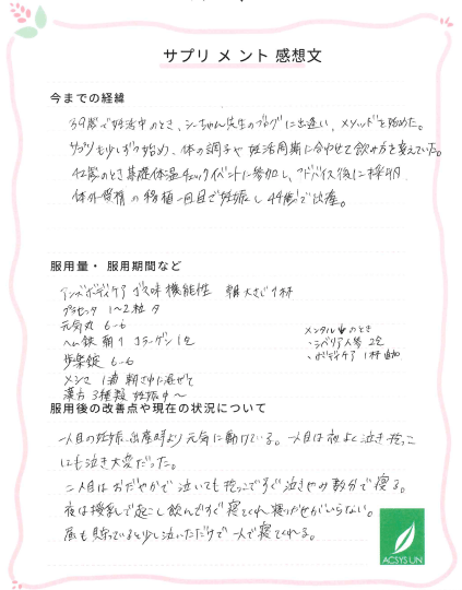 42歳のとき基礎体温チェックイベントに参加し、アドバイス後に採卵、体外受精の移植一回目で妊娠し、44歳で出産。