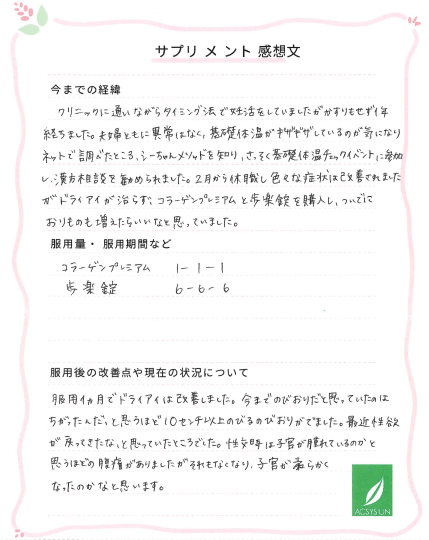 夫婦ともに異常はなく、基礎体温がギザギザしているのが気になり ネットで調べてところ、シーちゃんメソッドを知り、さっそく基礎体温チェックイベントに参加し、漢方相談を勧められました。