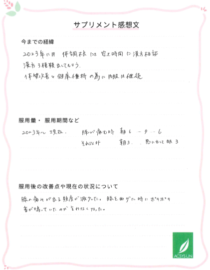膝を曲げた時に ポキポキ音が鳴っていたのが 言わなくなった。