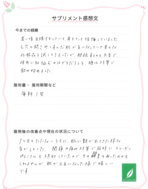 関節の痛み対策で 同時にコラーゲンプレミアムも摂取していたので その効果もあったのかもしれませんが、肌が元気になった様で嬉しいです。