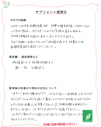 妊娠初期の出血もなく おとなしく生活し、このサプリのおかげで出産できました。