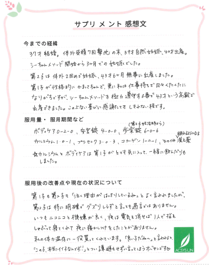 ボディケア0ー2ー0、安宮錠4ー0ー0、(第2子妊活期から)歩楽錠6-0-6 カルシウム1-0-1、プラセンタ3-0-3、コラーゲン1-0-1、その他眠れるようになる漢方薬