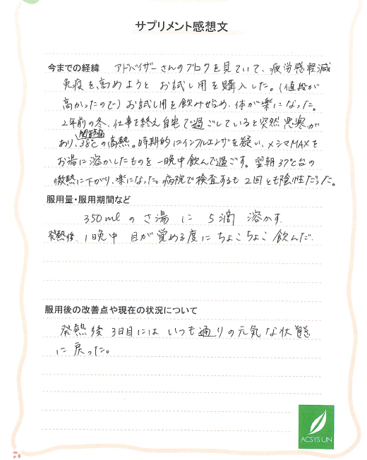アドバイザーさんのブログを見ていて、疲労感軽減、免疫を高めようとお試し用を購入した。(値段が高かったので)