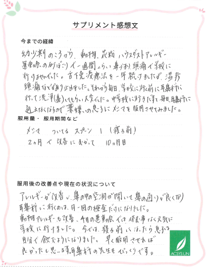 動物アレルギーも改善、4月の運動会では休む事なく元気に学校に行けました。