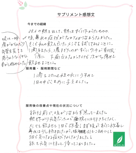 まず 咳がすぐに改善し 鼻水は少し続きましたが、吸引もこまめにして 3日で気になる症状なくなりました!旅も元気に行って帰ってこれました。