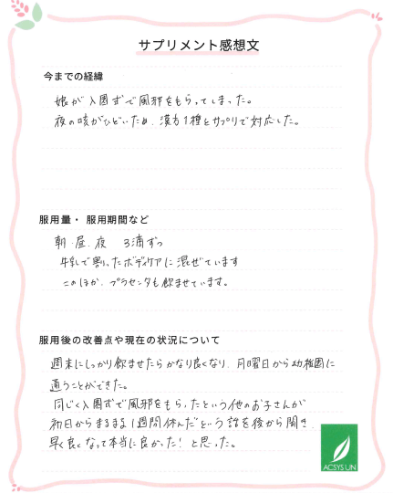 夜の咳がひどいため、漢方1種とサプリで対応した。