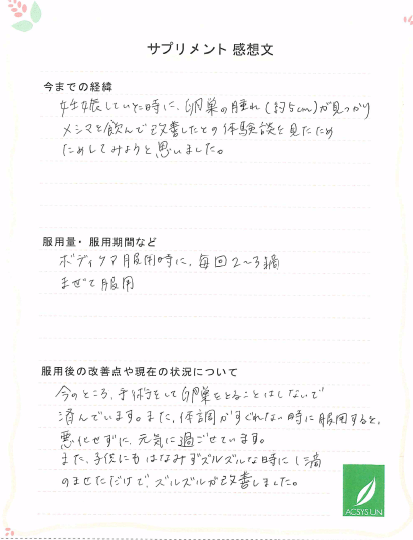 妊娠していた時に、卵巣の腫れ(約5㎝)が見つかり メシマを飲んで改善したとの経験談を見たため ためしてみようと思いました。