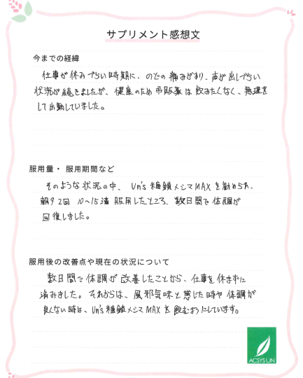 そのような状況の中、Un’s糖鎖メシマMAXを勧められ、朝夕2回10~15滴服用したところ、数日間で体調が回復しました。