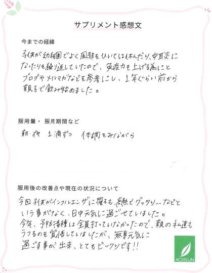 子供が幼稚園でよく風邪をひいては休んだり、中耳炎になったりを繰り返していたので、免疫力を上げる為にとブログやメルマガなどを参考にし、1年ぐらい前から親子で飲み始めました。