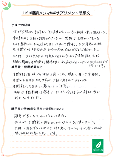 父が大腸がん手術をし、その直後からいろいろと相談に乗って頂きました。移転もあり、末期と診断されましたが、術後はおすすめして頂いたものを服用していたら、体力も戻り、仕事にも復帰し、ただ再発の心配や、手術でとり切れなかったところが悪化するのだけが心配でした。その後、メシマMAXが新商品で出るということでおすすめ頂き、さっそく服用を開始。手術前より顔色も良く、全く症状が出ていないのはメシマのおかげと思っています。