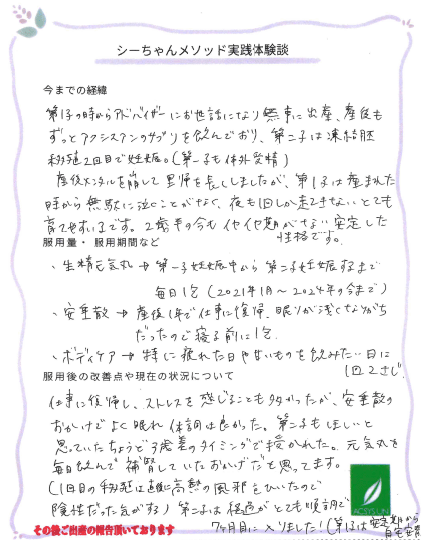 第1子の時からアドバイザーにお世話になり無事に出産、産後もずっとアクシスアンのサプリを飲んでおり、第二子は凍結胚移植2回目で妊娠。(第一子も体外受精)