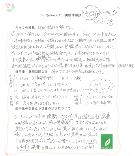 ①35歳から体外をしていたが、なかなか授からずシーちゃんメソッドを試し その半年後に妊娠・出産(このとき38才)<採卵7回・移植10回目>