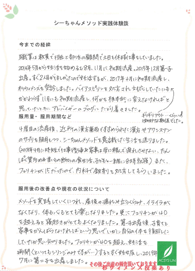 4度目の流産後、近所の漢方薬局ですすめられた漢方やアクシスアンのサプリを服用しつつ、シーちゃんメソッドを意識した生活を送りました。(2018年4月に時短で仕事復帰&家事は母に頼んで疲れさせない、たんぱく質多め&甘いもの断ちの食生活、子どもと一緒に8時就寝)