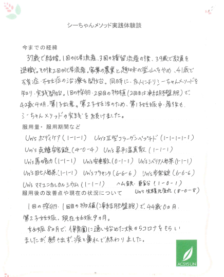 その後2回の化学流産。家業の農業と趣味の登山をやめ、41歳で不育症・不妊症の治療を開始。