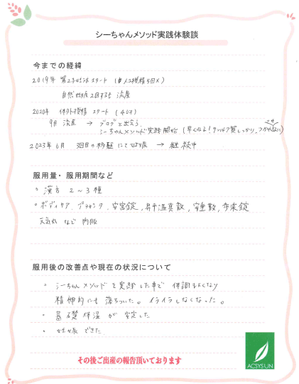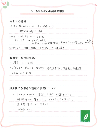 ・シーちゃんメソッドを実践した事で、体調もよくなり精神的にも落ちついた。イライラしなくなった。
