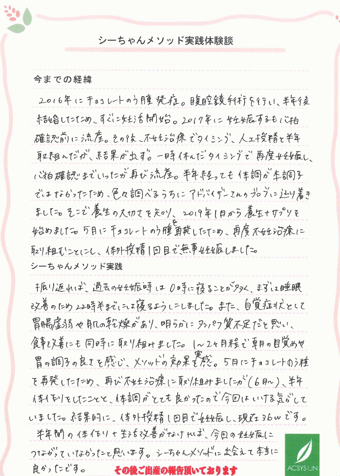 半年間の体作り+生活改善がなければ、今回の妊娠につながっていなかったと思います。