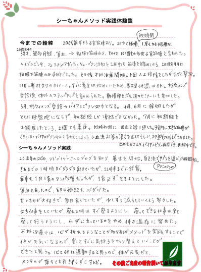 不妊治療中は、心が折れるようなことが多々あるが、メソッドを実践することで体が元気になるので、割とすぐに気持ちを切り替えていくことができたと思う。