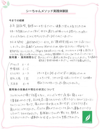 健康で体も元気だったため 特に問題なかったのですが、40才を過ぎて 妊娠について調べていた時にメソッドを知り、そこからサプリも少しずつ試してみていました。