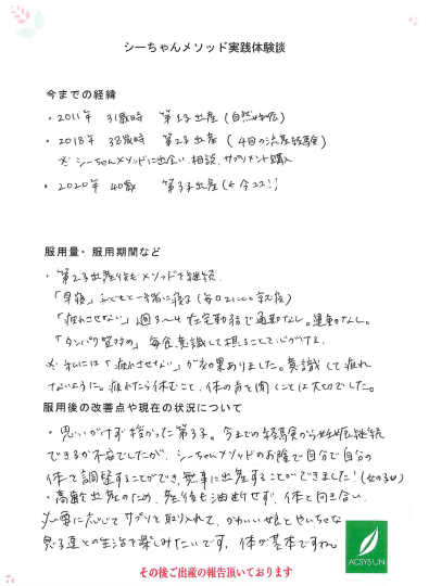 ・思いがけず授かった第3子。今までの経験から妊娠継続できるか不安でしたが、シーちゃんメソッドのお陰で自分で自分の体を調整することができ、無事に出産することができました!(女の子)