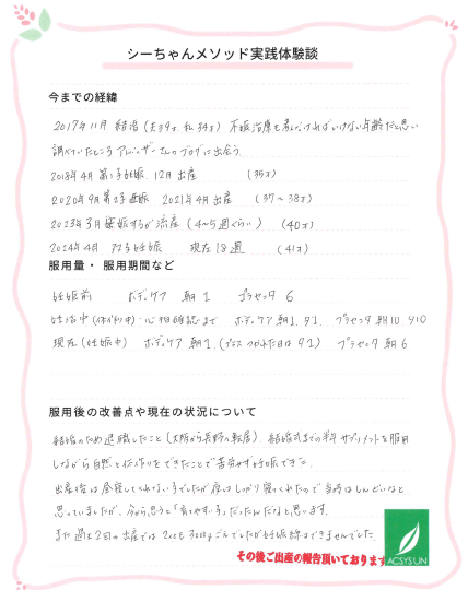 結婚のため退職したこと(大阪から長野へ転居)、結婚式までの半年サプリメントを服用しながら 自然と体作りをできたことで苦労せず妊娠できた。