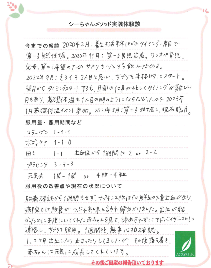 出血が酷かったのにお腹にいてくれた赤ちゃんを見て、諦めきれずにアドバイザーさんに連絡し、サプリを服用。1週間後に無事心拍確認。
