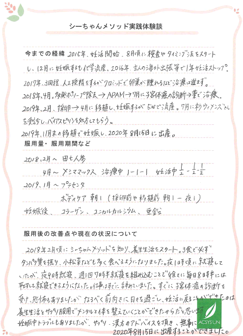 妊娠中トラブルもありましたが、サプリ、漢方のアドバイスを頂き、無事に2020年8月15日に出産することができました。