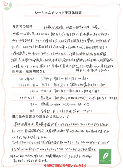 ただ40代なので、これが3回続いたらダメもとでトライしてみてと」とアドバイスがあり、出された漢方とおすすめされたサプリを飲んで、その周期のタイミング(シリンジ)で妊娠に至りました。現在18週です。