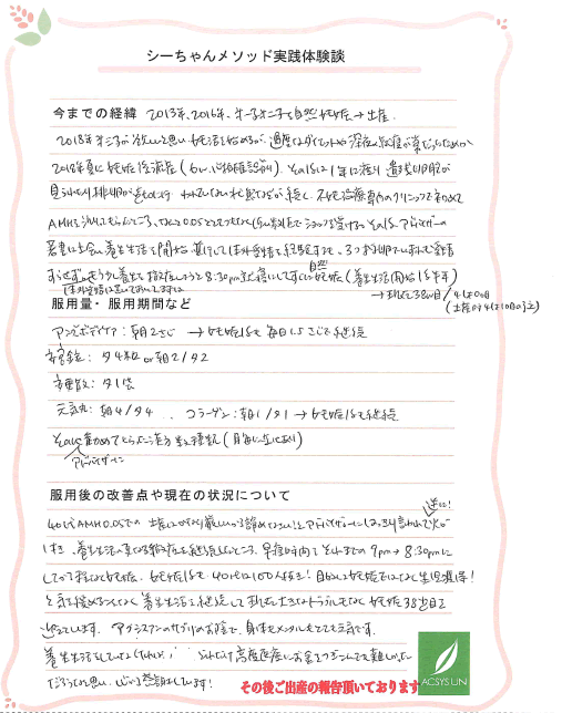 40代AMH0.05での出産はかなり厳しいから諦めなさい!とアドバイザーにはっきり言われて逆に!火が付き、養生生活の更なる徹底を継続したところ、早寝時間をそれまでの9pm→8:30pmにしてから程なく妊娠、妊娠後も40代は100人抜き!目的は妊娠ではなく生児獲得!と気を緩めることなく養生生活を継続して現在大きなトラブルもなく妊娠38週目を迎えています。