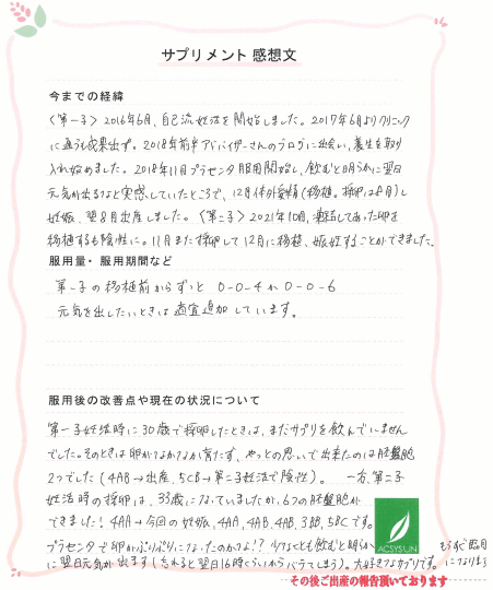 2018年11月プラセンタ服用開始し、飲むと明らかに翌日元気が出るなと実感していたところで、12月体外受精(移植。採卵は8月)し妊娠、翌8月出産。