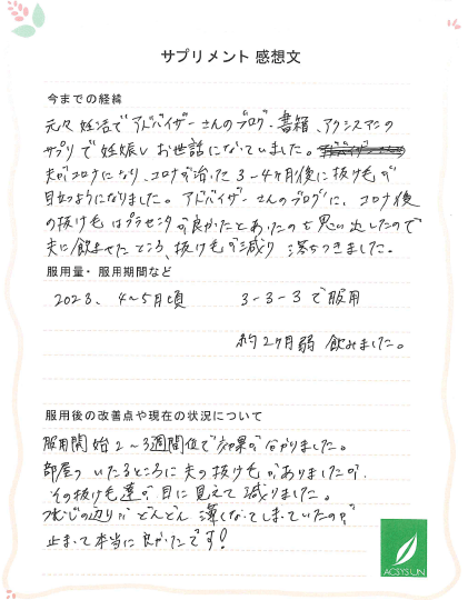 アドバイザーさんのブログに、コロナ後の抜け毛はプラセンタが良かったとあったのを思い出したので夫に飲ませたところ、抜け毛が減り 落ち着きました。