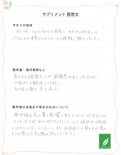 アドバイザーさんのブログを拝見し、40代の妊活にはプラセンタが重要なのではないかと理解し購入しました。